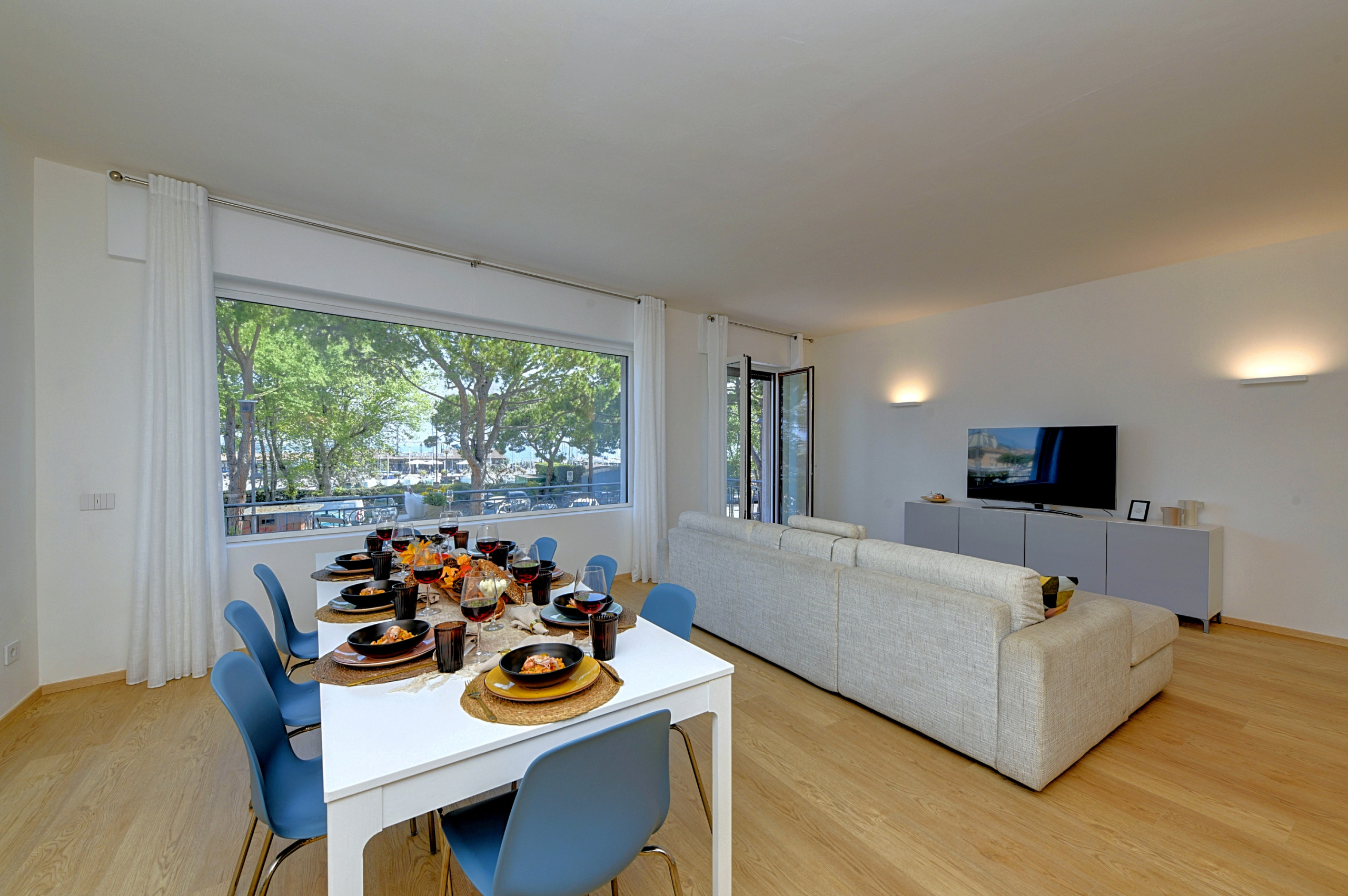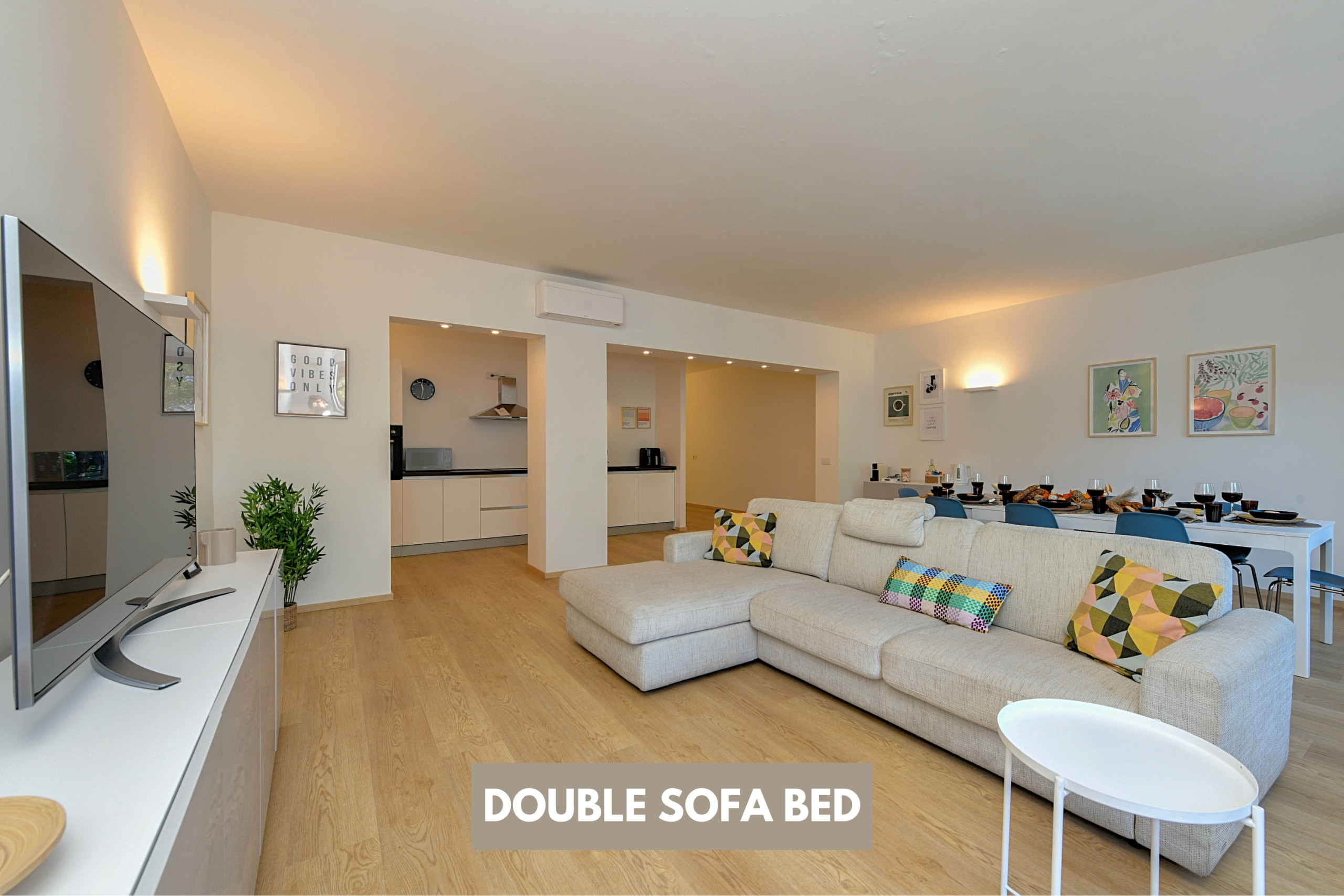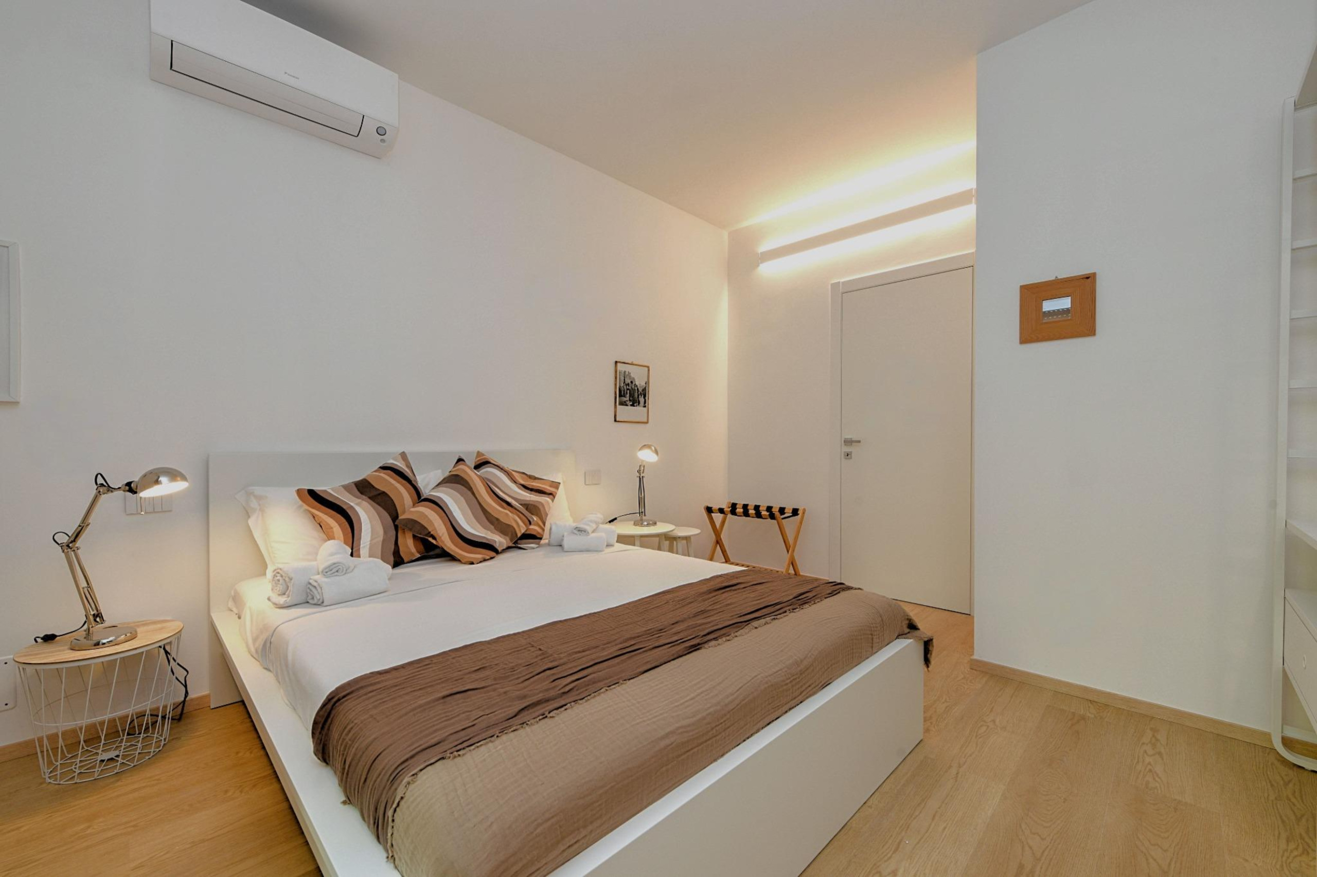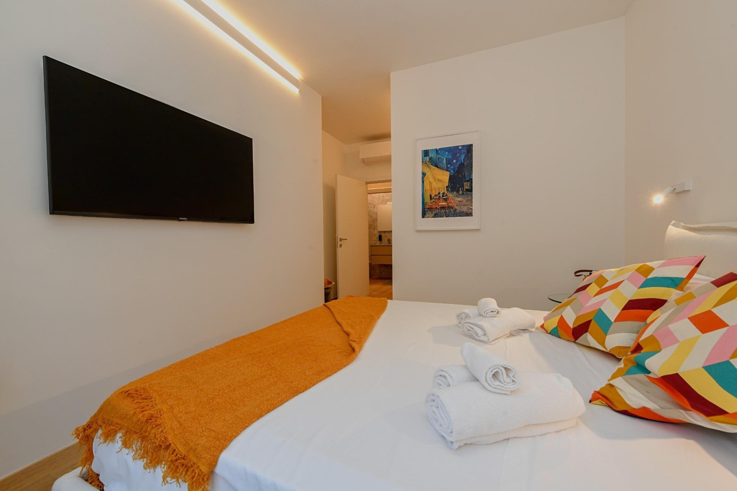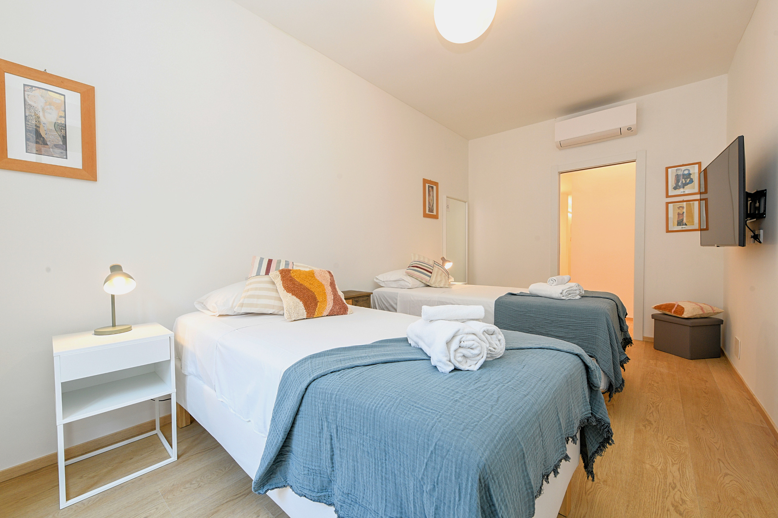 Apartament posiada dwie eleganckie sypialnie małżeńskie, jedna z nich ozdobiona jest niezależną garderobą, pokój z dwoma pojedynczymi łóżkami, pokój z pojedynczą sofą-łóżkiem oraz małżeńskie łóżko-sofę w salonie. Każdy pokój wyposażony jest w klimatyzację, płaski telewizor, a także bezpośredni dostęp do prywatnego balkonu, idealnego do relaksu w ciszy i intymności.