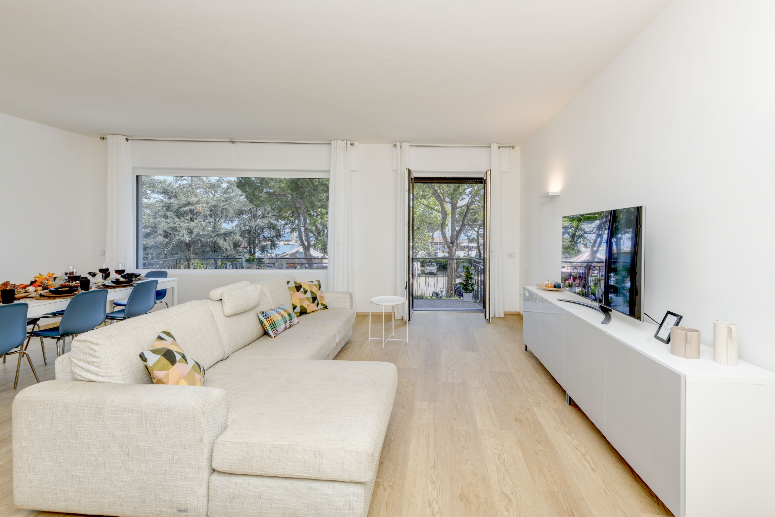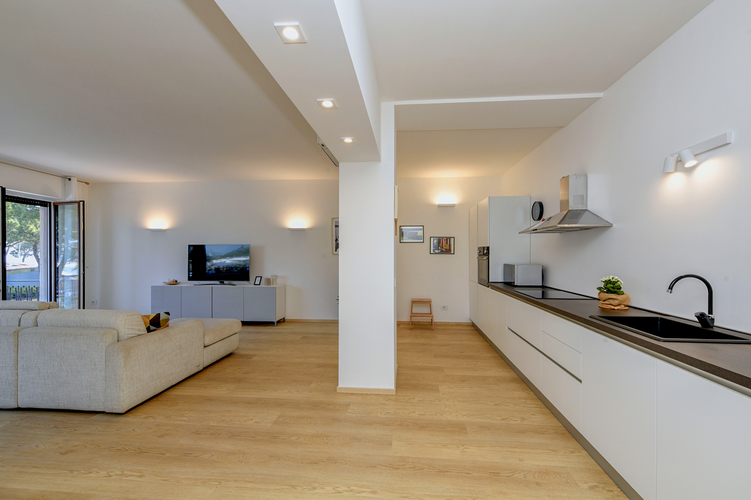 Zaraz po przekroczeniu progu, witani są państwo atmosferą pełną światła i relaksu: przestronny open space harmonijnie łączy amerykańską kuchnię, strefę jadalną i salon, wzbogacony dużą narożną sofą, która w razie potrzeby przekształca się w wygodne małżeńskie łóżko. Scenograficzne okno oprawia widok na jezioro i wpuszcza poranne światło, podczas gdy balkon od strony jeziora pozwala zanurzyć się w życiu centrum i cieszyć się płynącym życiem.
