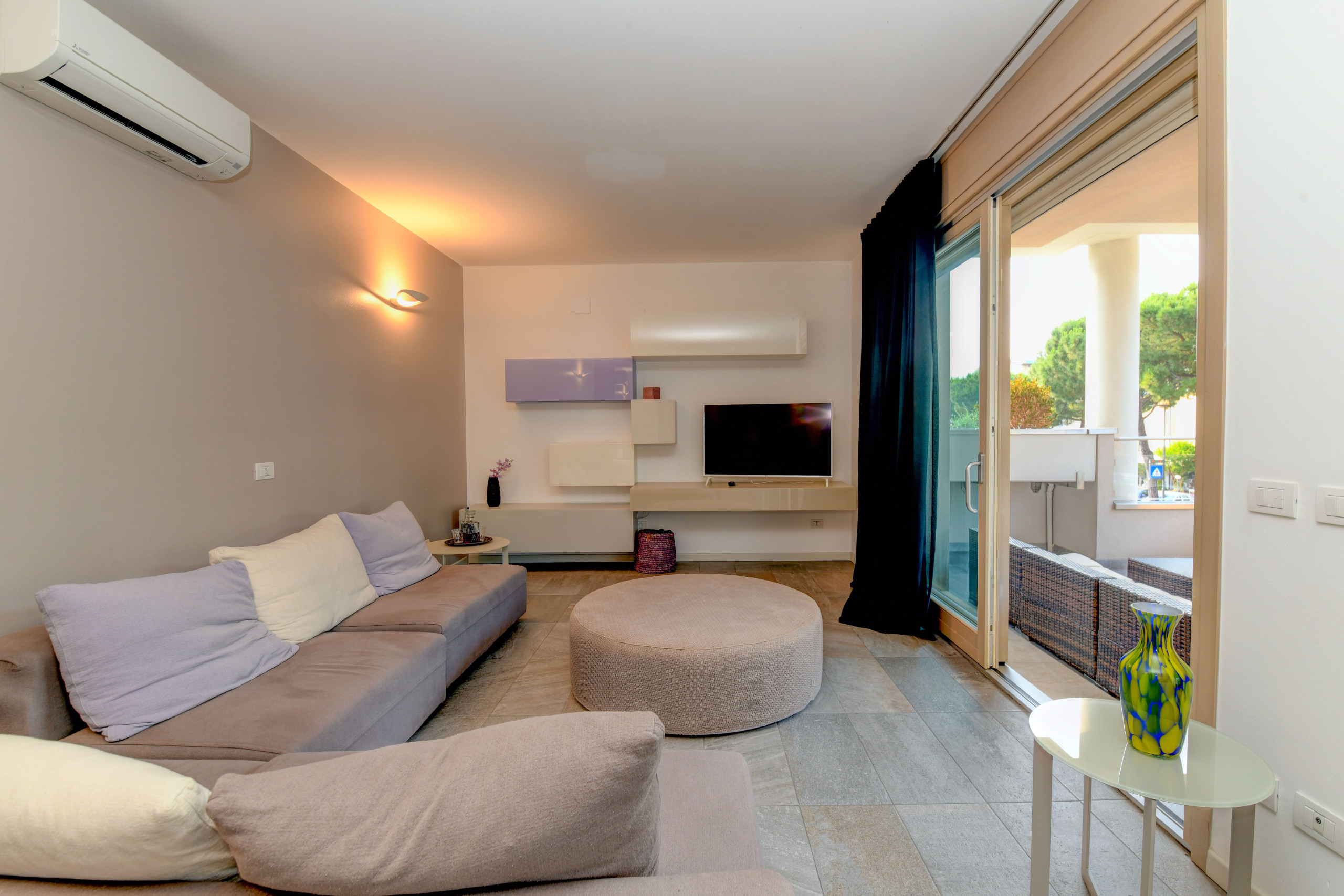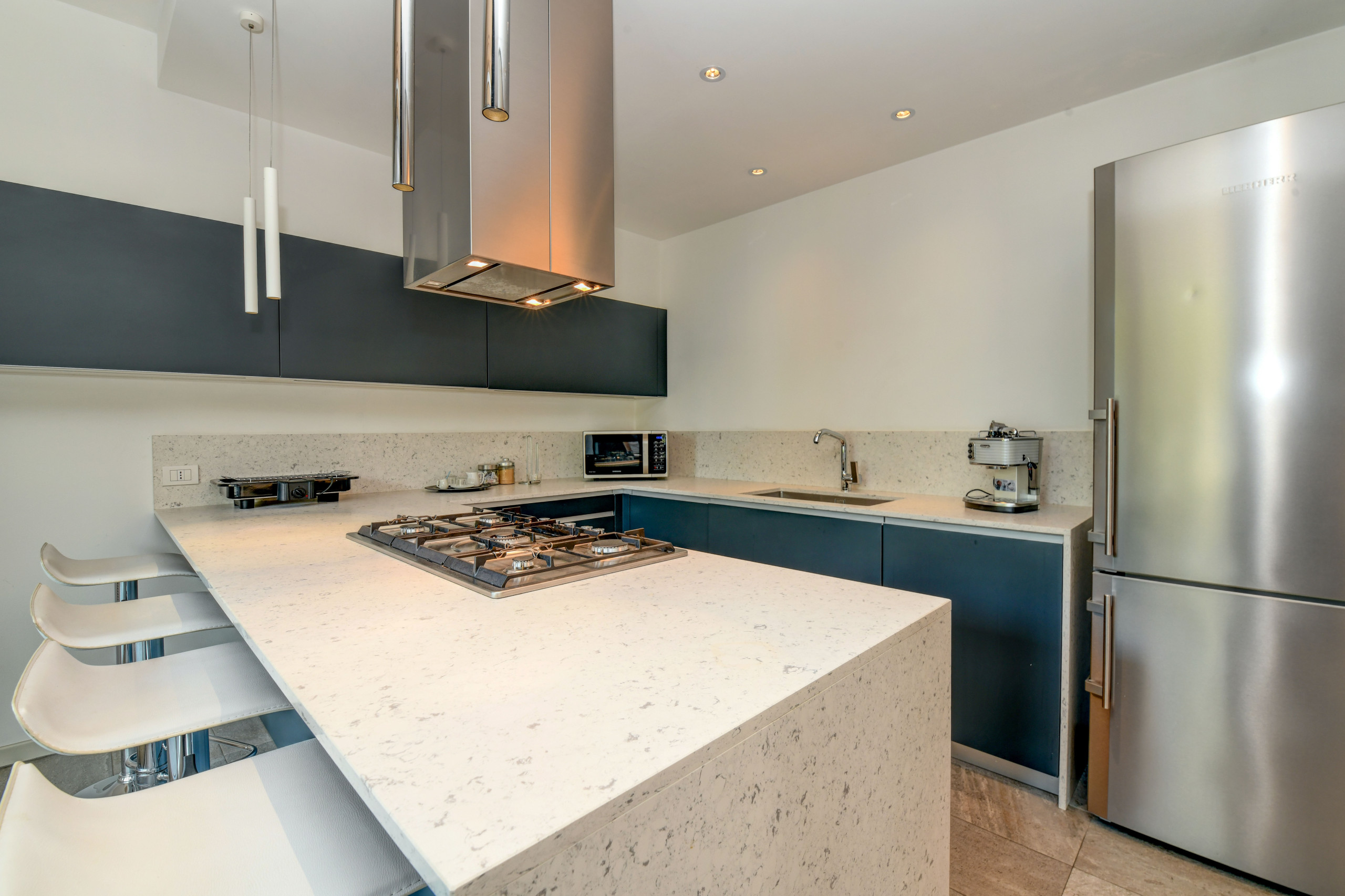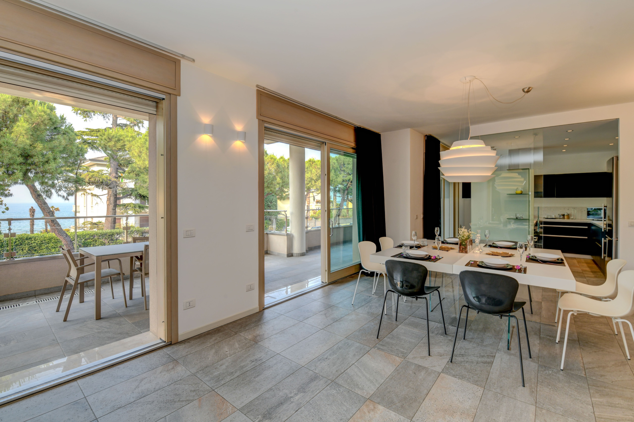 Apartament wyróżnia się elegancją i funkcjonalnością przestrzeni. Po wejściu przywitamy się w przestronnym i jasnym salonie, urządzonym z gustem i wyposażonym we wszystkie udogodnienia: klimatyzację, Smart TV i wygodną sofę, idealną do relaksu lub wieczoru w towarzystwie. Strefa dzienna łączy się bezpośrednio z kuchnią w stylu amerykańskim, oddzieloną eleganckimi przesuwnymi drzwiami, dzięki czemu jest idealna do otwartego i jasnego użytkowania. Kuchnia jest przestronna, wyposażona w wyspę i wszystkie niezbędne akcesoria do przygotowania pysznych potraw lub aperitifów. Z kuchni i salonu trzy duże drzwi balkonowe prowadzą na obszerny taras o powierzchni 48 m², oferujący panoramiczny widok na jezioro. Ta przestrzeń zewnętrzna jest prawdziwym rajem, z dużym stołem, krzesłami i wygodną sofą, idealną do posiłków na świeżym powietrzu lub chwil relaksu. Wieczorem atmosfera staje się jeszcze bardziej urokliwa dzięki dyskretnym reflektorom, tworząc idealną scenerię do delektowania się widokiem i spokojem.