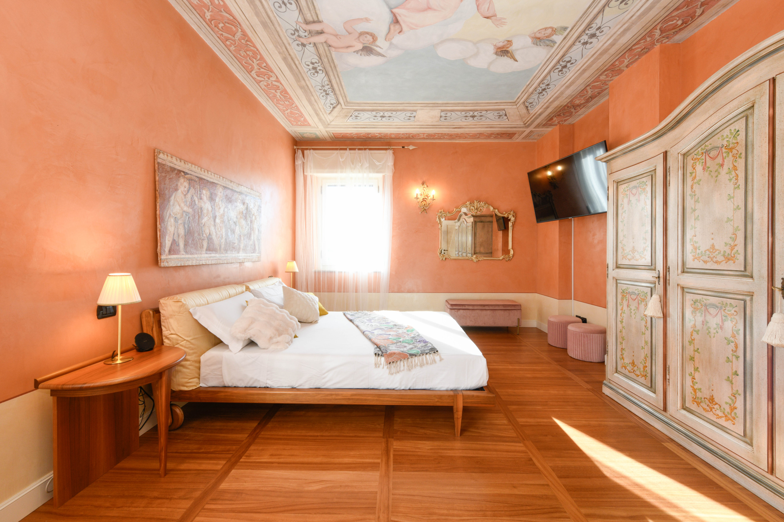 Luksusowa sypialnia z freskami i parkietem w Villa Bugatti